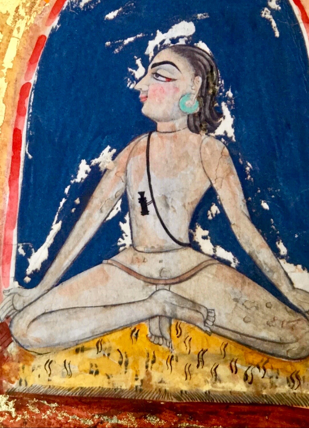 The oldest depiction of a Yoga posture is likely the Pashupati seal found in the Indus Valley archaeological dig in the 1920’s. The Indus-Saraswati civilization is dated to 2500 BC and earlier, but the earliest layers of the site cannot be excavated due to water at the lowest layers. The seal is a reasonable depiction of Pashupati or Shiva with what looks like three faces and buffalo antlers that form a similar shape to Shiva’s three-pronged trident. There are five beasts surrounding him and he is seated in siddhasana (also known as the accomplished pose, supposed to be one of the four most powerful sitting poses suited for meditation).